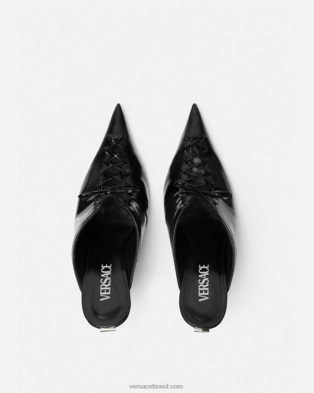 mulas de couro pontiagudas caracterizadas por salto agulha de metal curvo com atacadores de couro tecidos à mão e fixos ao longo da parte superior, inspirados em designs de espartilhos.