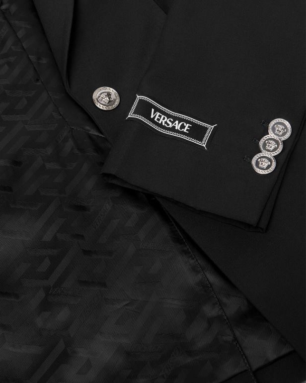 um blazer de peito único totalmente forrado com um botão medusa acentuado, lapelas pontiagudas e uma etiqueta Versace costurada no punho da manga.