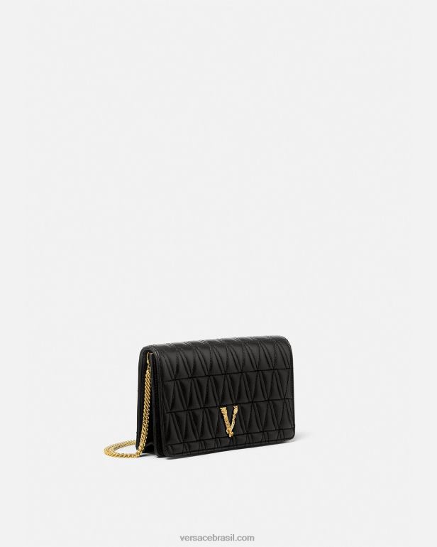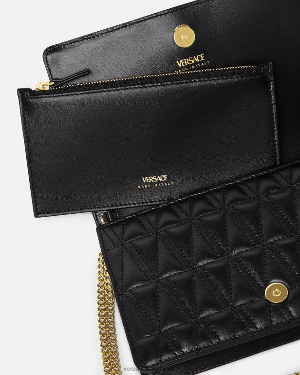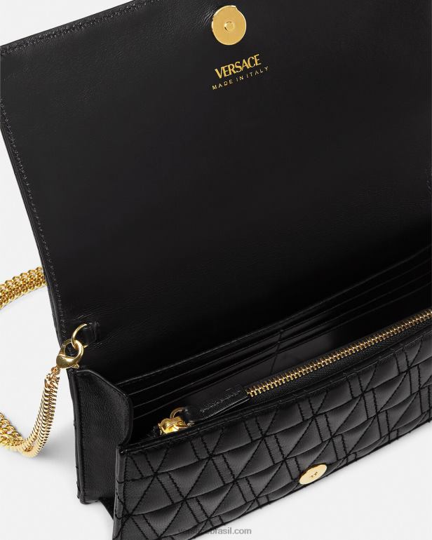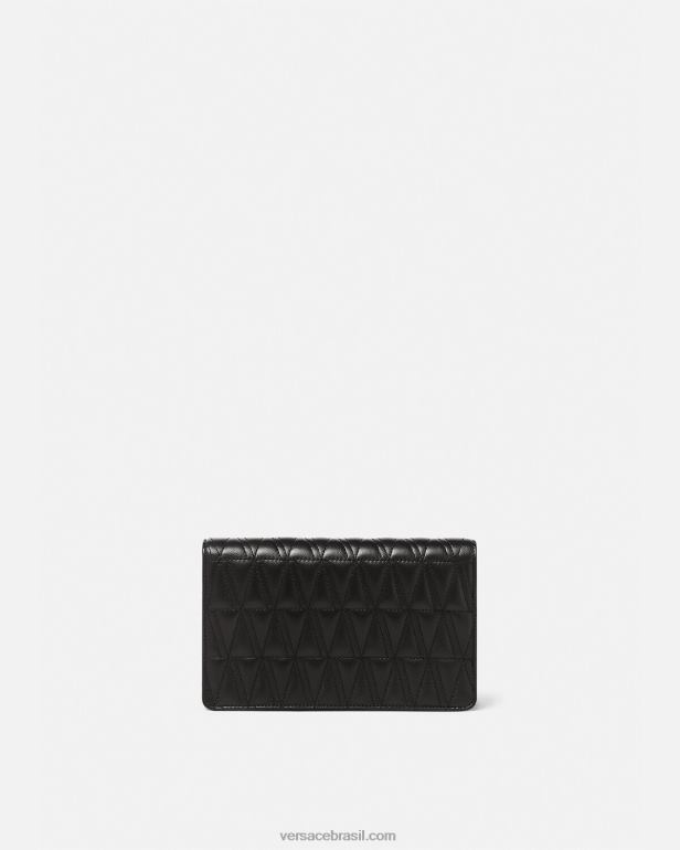 confeccionada em couro em padrão V acolchoado, a clutch virtus apresenta um V barroco com detalhes de folhas de acanto gravadas e fecho de aba magnética. a pequena bolsa de noite pode ser segurada na mão ou suspensa por uma corrente fina e destacável.