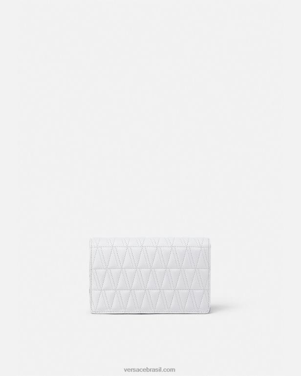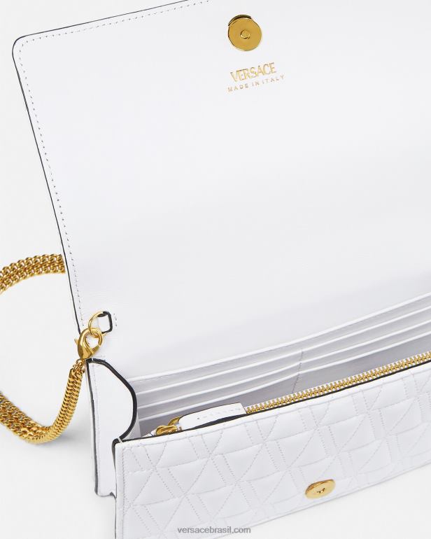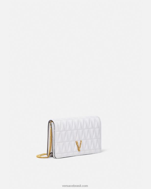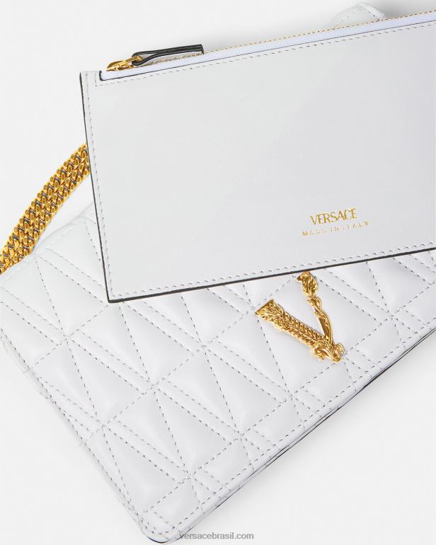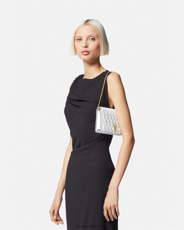 confeccionada em couro em padrão V acolchoado, a clutch virtus apresenta um V barroco com detalhes de folhas de acanto gravadas e fecho de aba magnética. a pequena bolsa de noite pode ser segurada na mão ou suspensa por uma corrente fina e destacável.