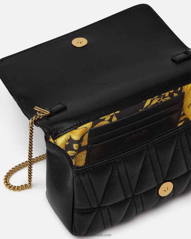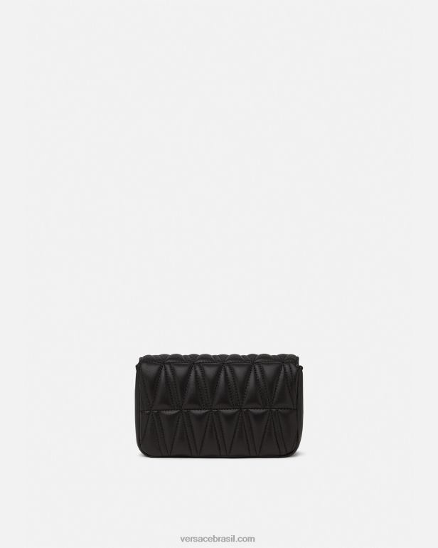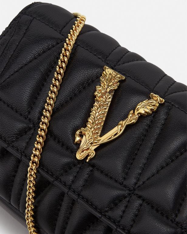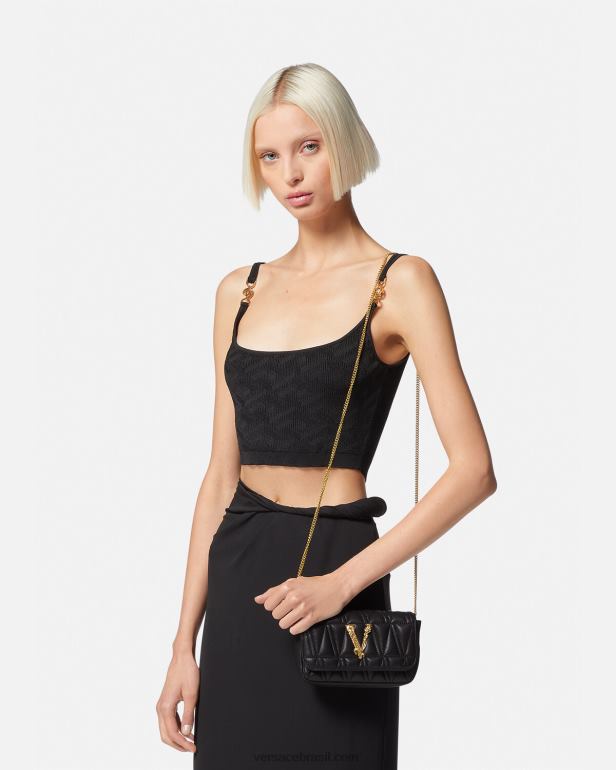 Confeccionada em couro italiano acolchoado em padrão V, a mini bolsa Virtus apresenta ferragem Barocco V com fecho de aba magnética, completa com alça de ombro, compartimentos internos planos para cartões e forro estampado Barocco.