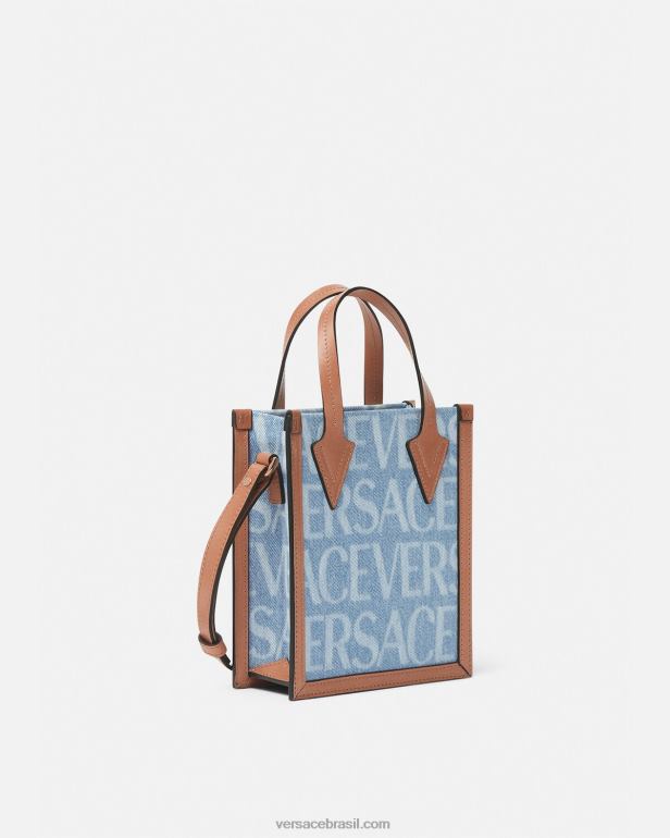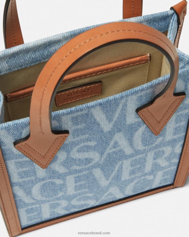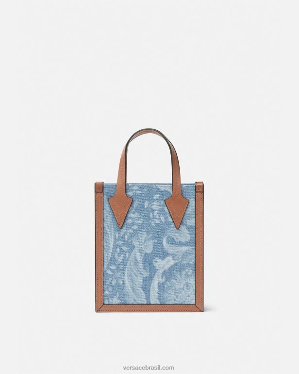 uma pequena sacola crossbody feita de painéis de jeans com laser no estilo Versace e padrão de silhueta barroco com detalhes em couro. o estilo open-top é finalizado com alças de couro e uma alça de ombro ajustável e removível.