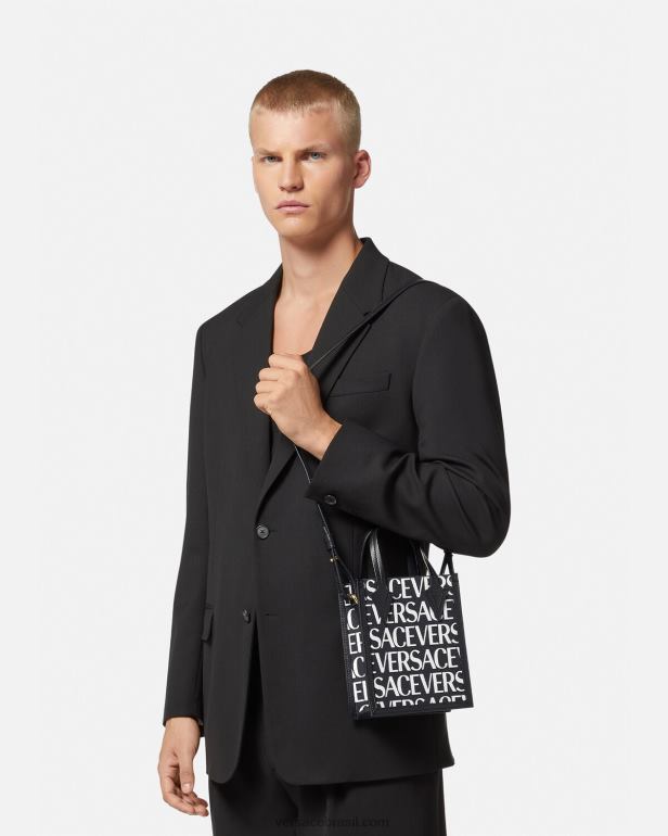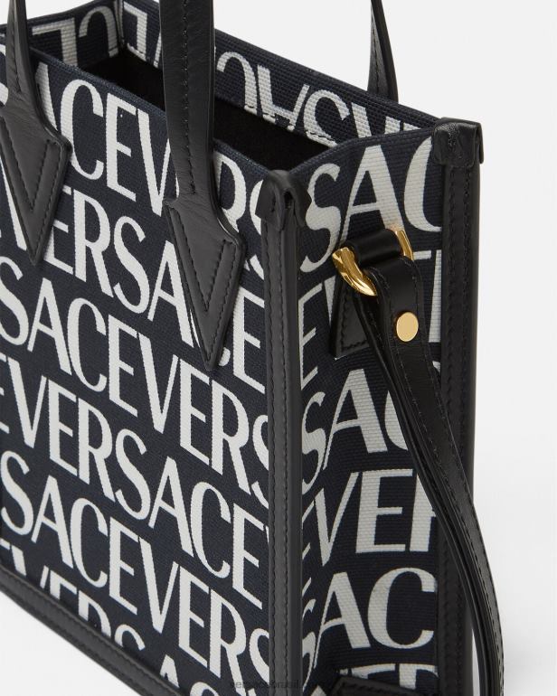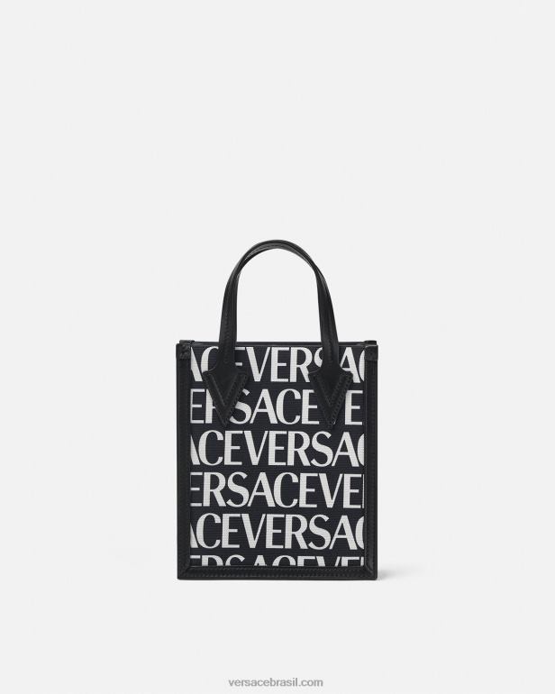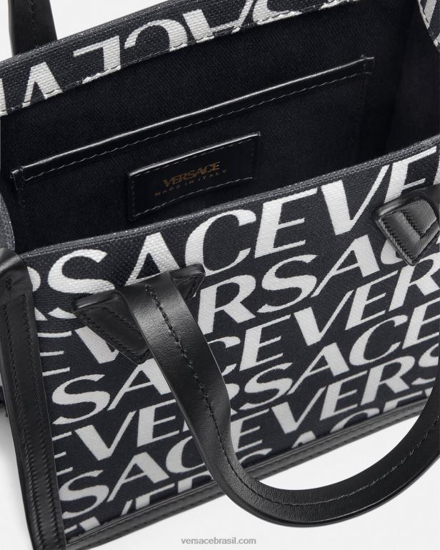 uma pequena bolsa crossbody feita de lona com impressão integral do logotipo Versace. o estilo aberto é finalizado com alças superiores e uma alça de ombro ajustável.