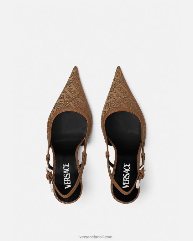 esses sapatos tipo sling-back são confeccionados em lona jacquard Versace com acabamentos em couro, apresentando design de salto alto e bico fino.