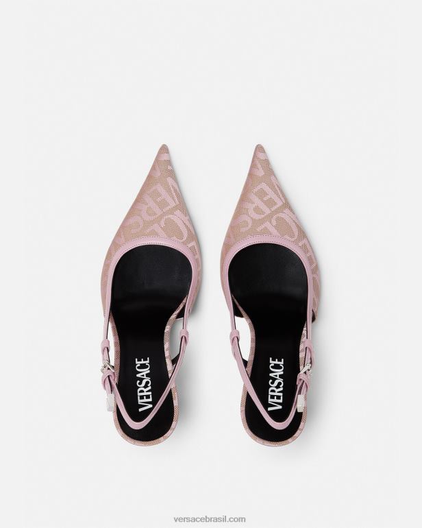esses sapatos tipo sling-back são confeccionados em lona jacquard Versace com acabamentos em couro, apresentando design de salto alto e bico fino.