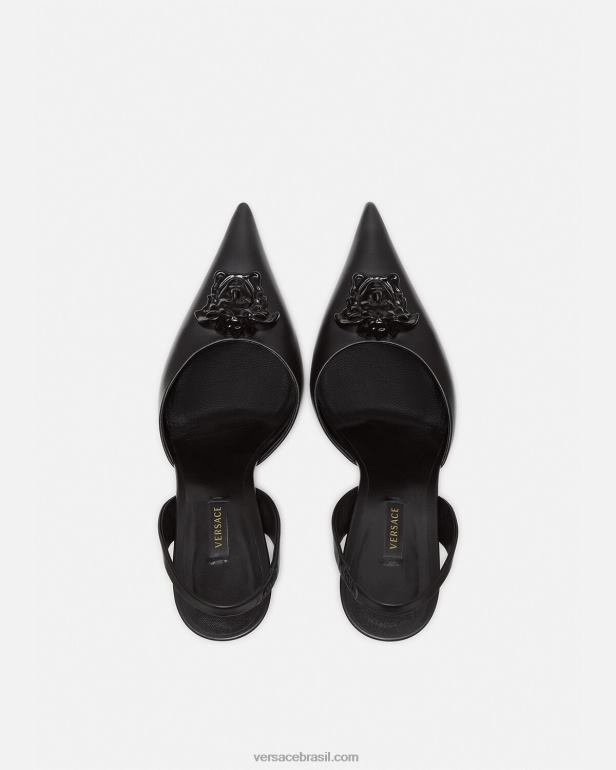 confeccionados em couro de bezerro flexível, esses sofisticados slingbacks elevam a aparência da manhã à tarde. a silhueta elegante dos dedos pontiagudos é adornada com uma placa de medusa - a mesma decoração encontrada nas portas da primeira sede da marca em Milão.
