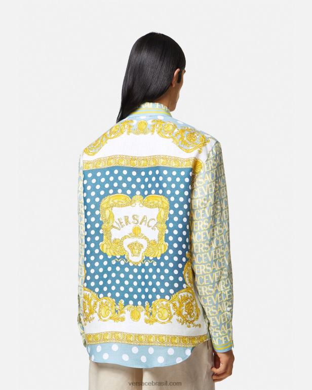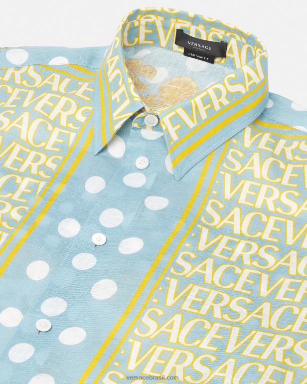 esta camisa de mangas compridas é feita de linho com estampa versátil Versace na frente e uma estampa barroca de concha nas costas com fundo de bolinhas.