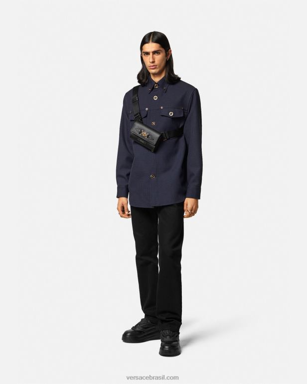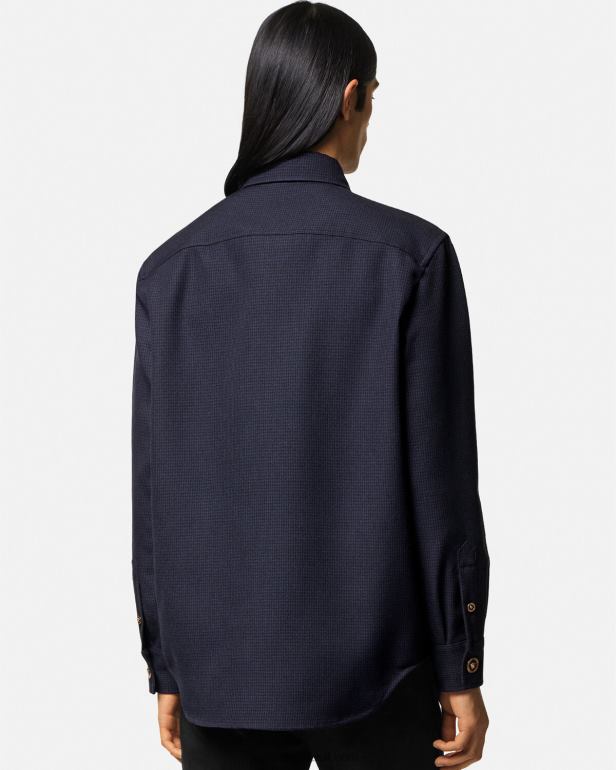 confeccionada em lã compacta em padrão houndstooth, esta camiseta de mangas compridas é acentuada por botões e tachas esmaltados de medusa. este estilo de ajuste regular é detalhado com bolsos frontais no peito.