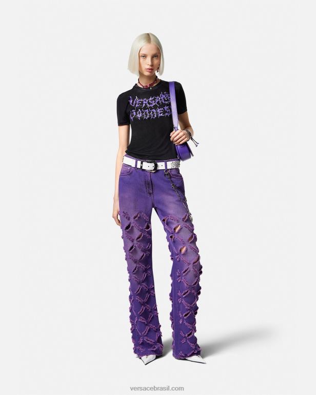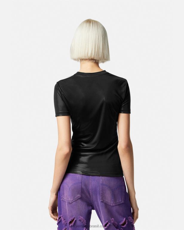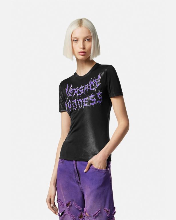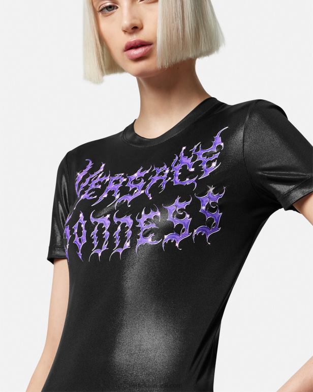 uma camiseta de jersey líquido de manga curta com corte justo e com um logotipo flamejante da "deusa Versace" na frente para um toque grunge Versace.