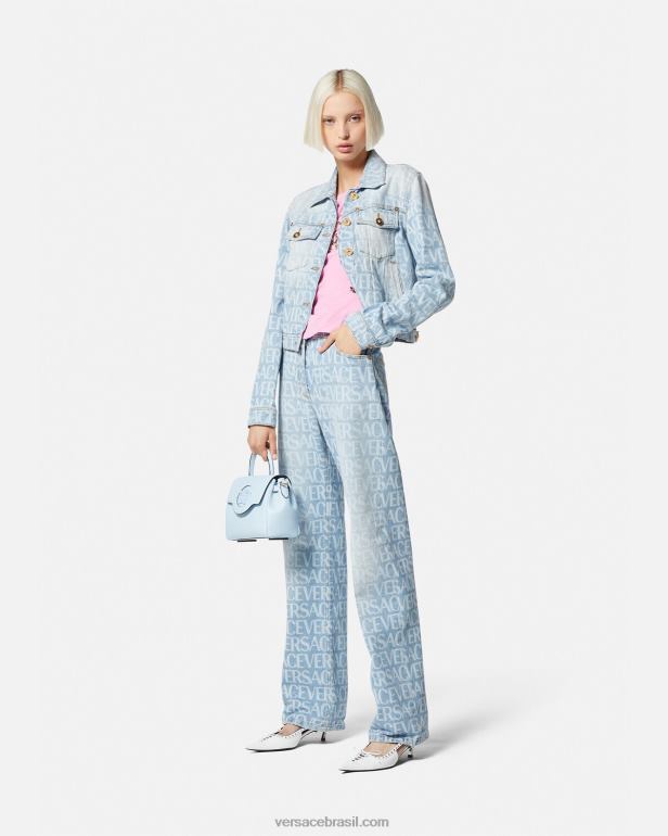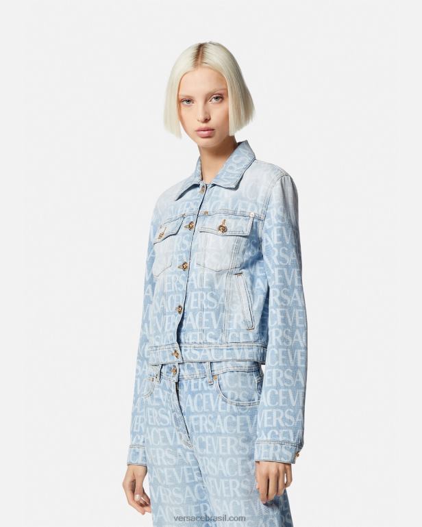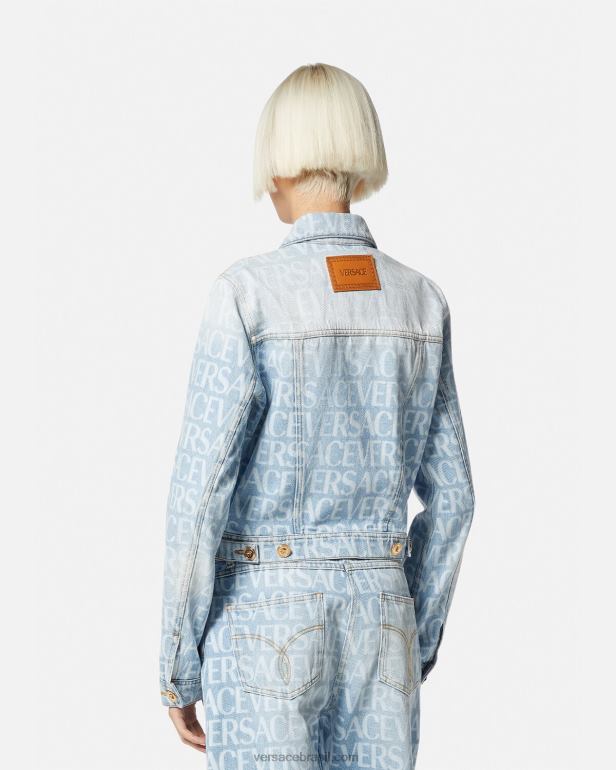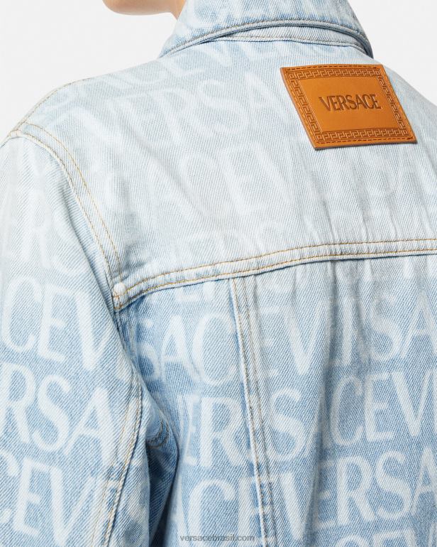feita de jeans com acabamento lavado claro, esta jaqueta levemente cortada apresenta um logotipo Versace estampado a laser com botões de medusa e um logotipo de couro na parte de trás.