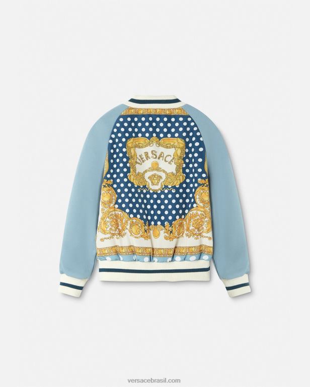 uma jaqueta acolchoada com painéis versace de náilon com estampa infantil de bolinhas na frente, mangas de jersey e uma estampa infantil de bolinhas barrocas em forma de concha nas costas. o estilo de agasalho se for finalizado com acabamentos listrados com nervuras.