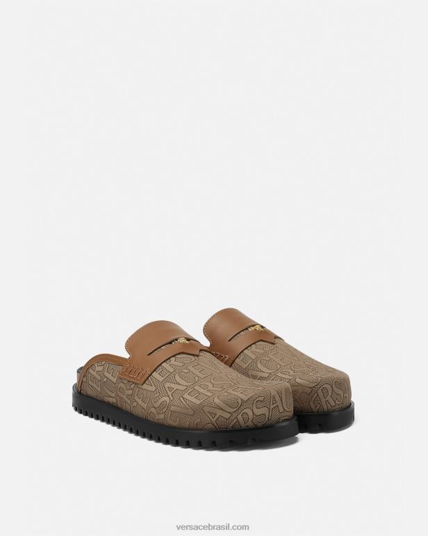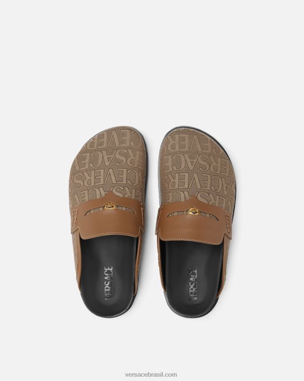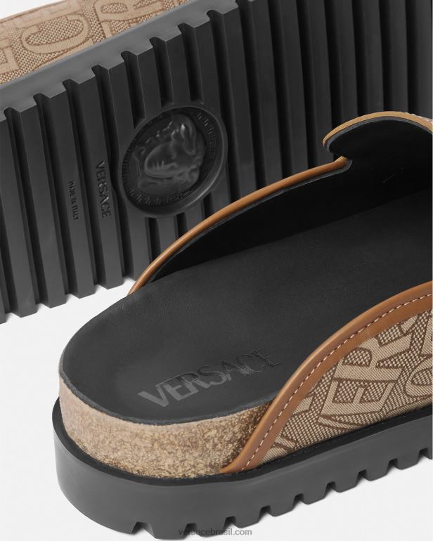 essas mulas slip-on são colocadas em entressolas de cortiça moldada e solas de borracha para um passo leve. eles são feitos de parte superior de lona jacquard com um logotipo Versace e detalhes em medusa na frente.