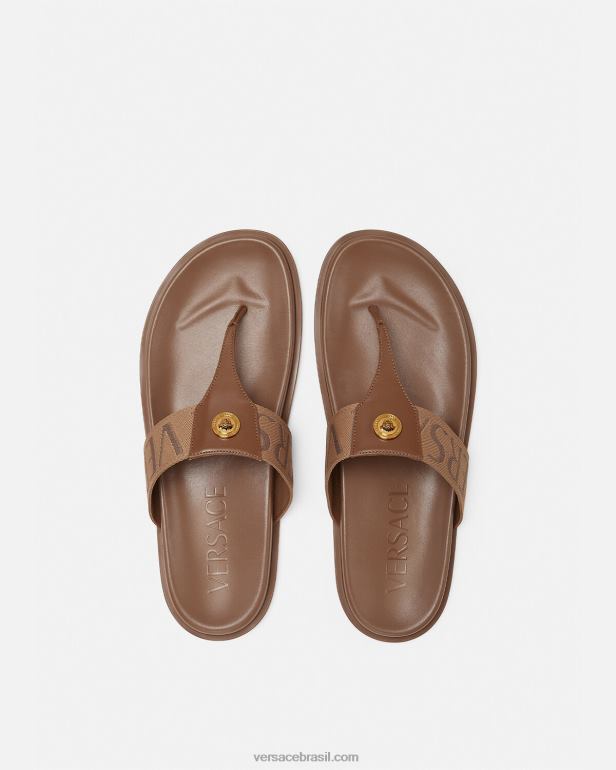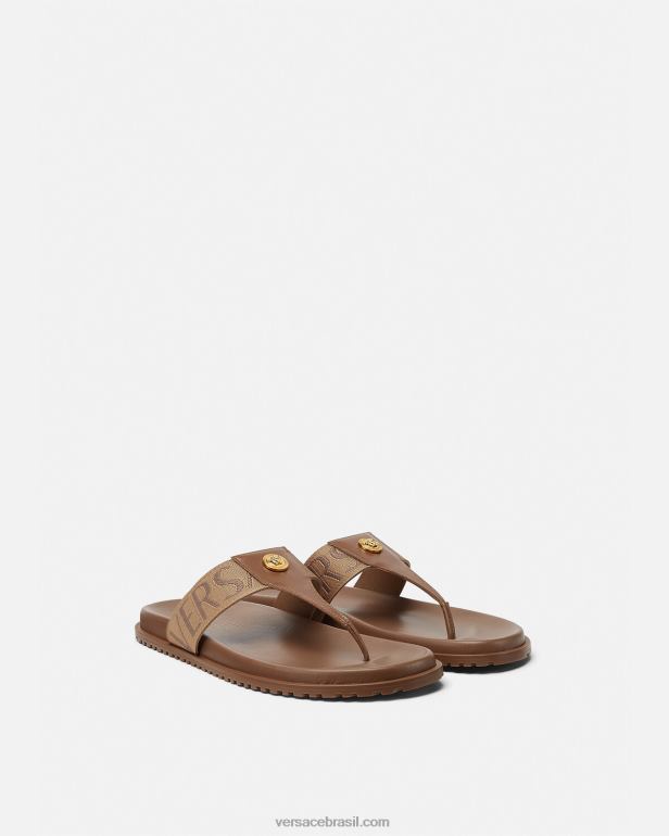 sandálias planas com barra em t com acabamentos em couro e padrão jacquard versace nas tiras. este design é baseado em solas moldadas confortáveis.