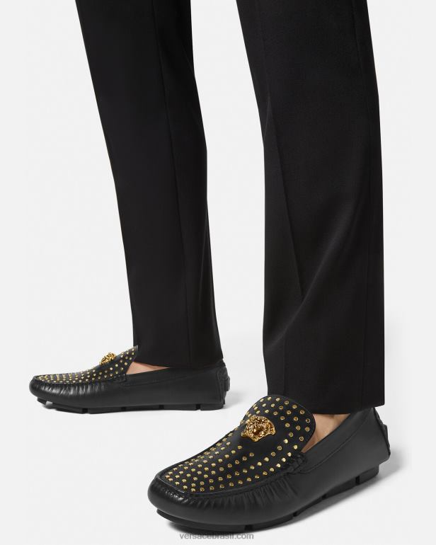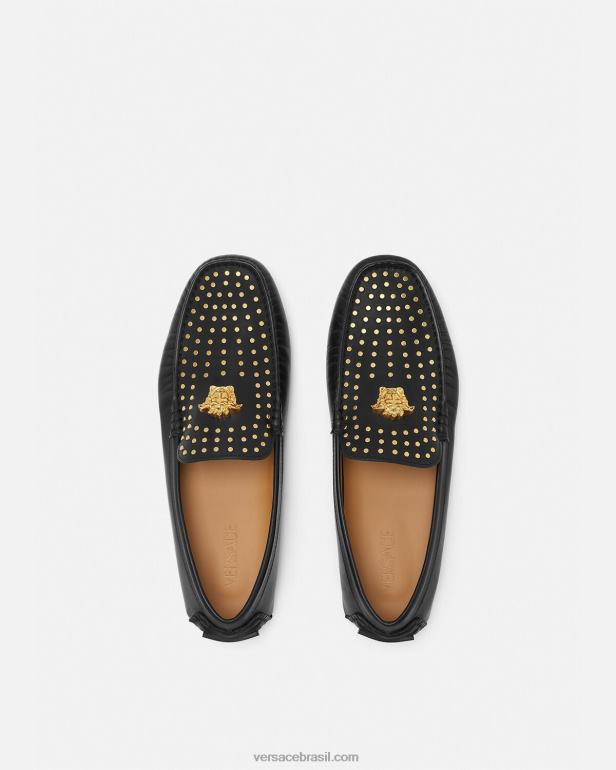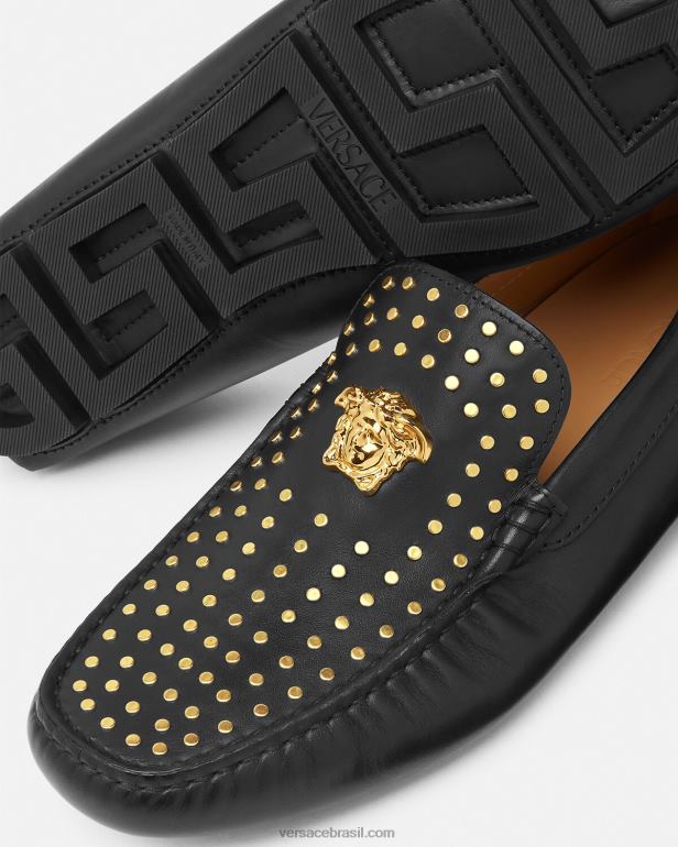 um estilo de sapato slip-on para dirigir, esses mocassins de couro são acentuados por um hardware la medusa tridimensional na parte superior e apresentam um logotipo emborrachado no contraforte do calcanhar. o par é colocado sobre uma sola de borracha com padrão greca.