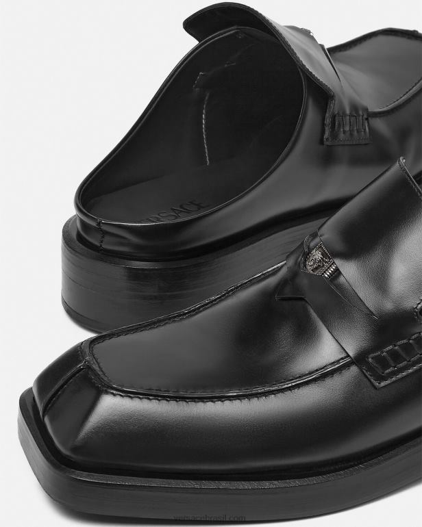 feitos de couro, esses mocassins com costas abertas apresentam biqueira quadrada cinzelada e são detalhados com uma ferragem de medusa quadrada na alça de um centavo. o par tem saltos empilhados de couro.