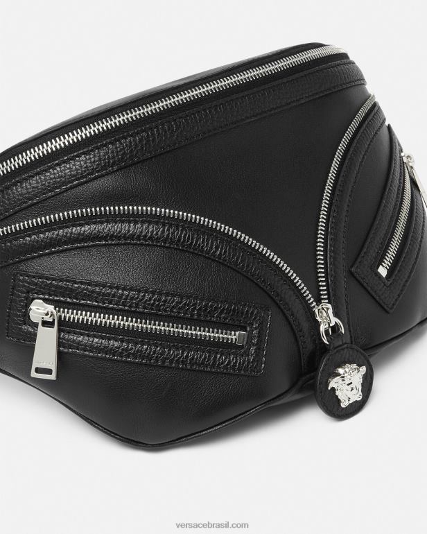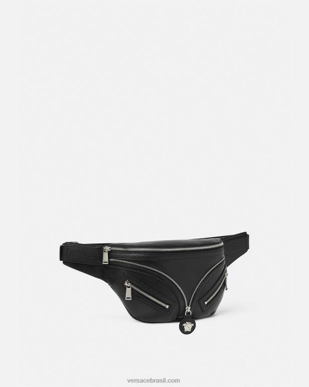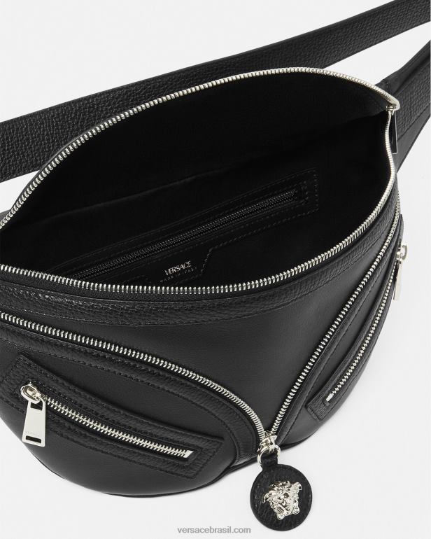 uma reedição de uma silhueta hobo de arquivo, a bolsa de cinto repetida é confeccionada em couro italiano flexível. inspirado no motociclista, um puxador decorativo de medusa e bolsos diagonais com zíper adicionam uma atitude grunge com um toque versace. o estilo pode ser usado transversalmente, pendurado no ombro ou na cintura.
