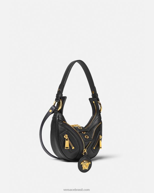 Versace apresenta dua lipa x versace – uma coleção cápsula co-desenhada com dua lipa. uma reedição de uma silhueta hobo de arquivo, a bolsa de ombro repetida é feita de couro liso com uma alça removível. inspirado no motociclista, um extrator de pingente de medusa e zíperes diagonais adicionam uma atitude grunge com um toque versace.