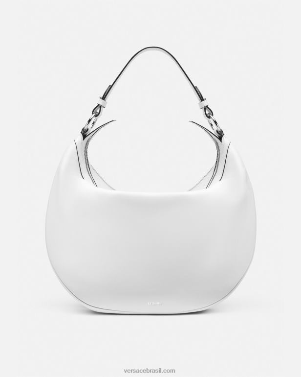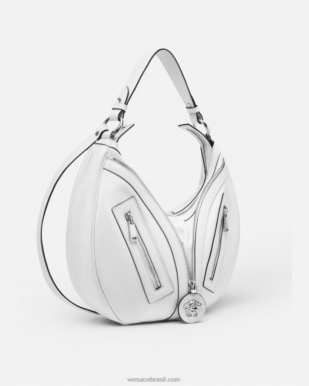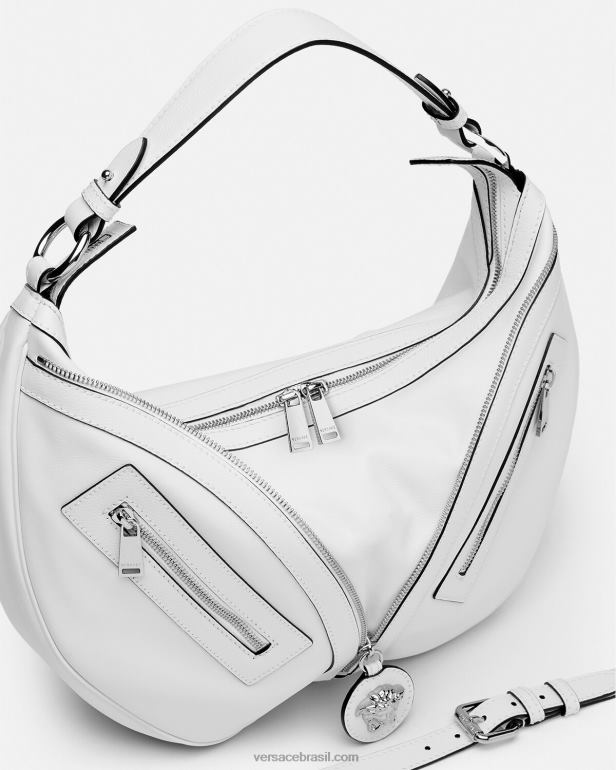 uma reedição de uma silhueta hobo de arquivo, a bolsa de ombro repetida é confeccionada em couro italiano flexível com uma alça de ombro removível. inspirado no motociclista, um extrator de pingente de medusa e zíperes diagonais adicionam uma atitude grunge com um toque versace.