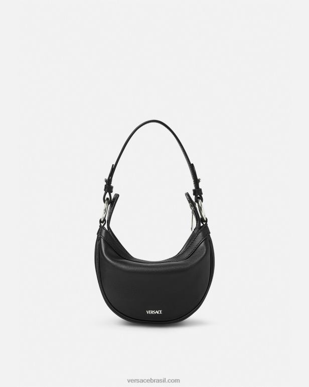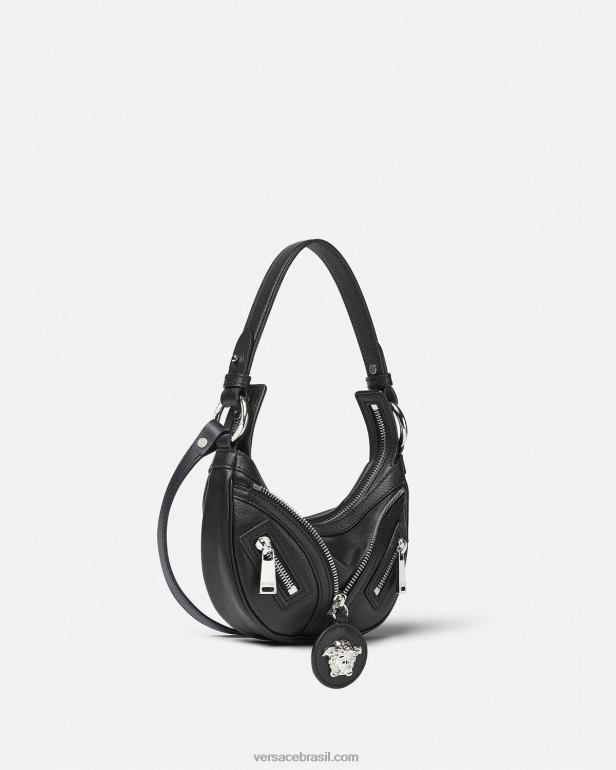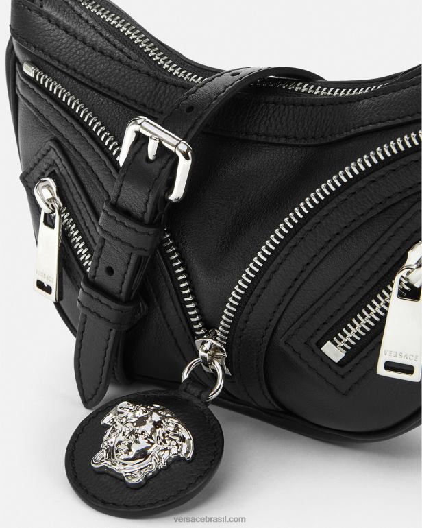 uma mini versão de uma silhueta hobo de arquivo, a bolsa de ombro repetida é feita de couro italiano flexível com uma alça de ombro removível. inspirado no motociclista, um extrator de pingente de medusa e zíperes diagonais adicionam uma atitude grunge com um toque versace.