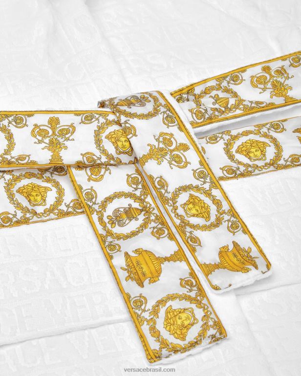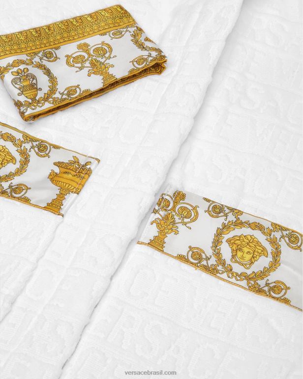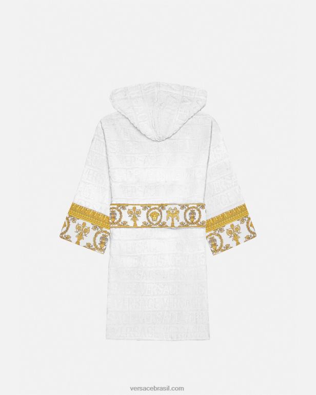 este roupão atoalhado com capuz para os mais pequenos apresenta um motivo versace em tons contrastantes com mangas estampadas barrocas e cinto envolvente.