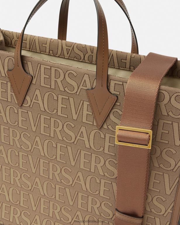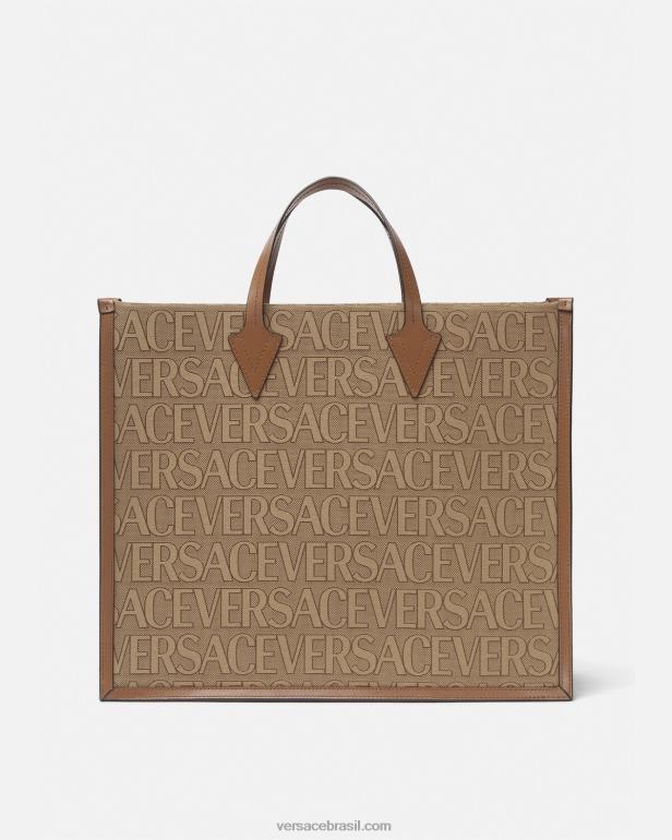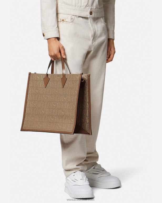 uma sacola espaçosa feita de lona jacquard no padrão Versace com detalhes em couro. o estilo open-top é finalizado com alças de couro e uma alça de ombro ajustável e removível.
