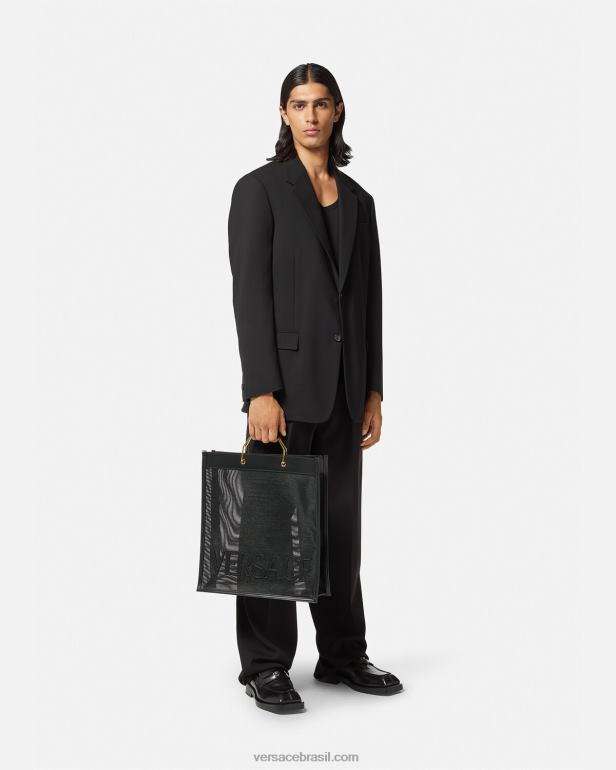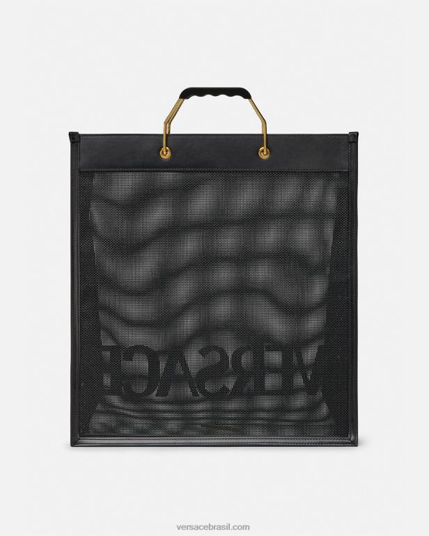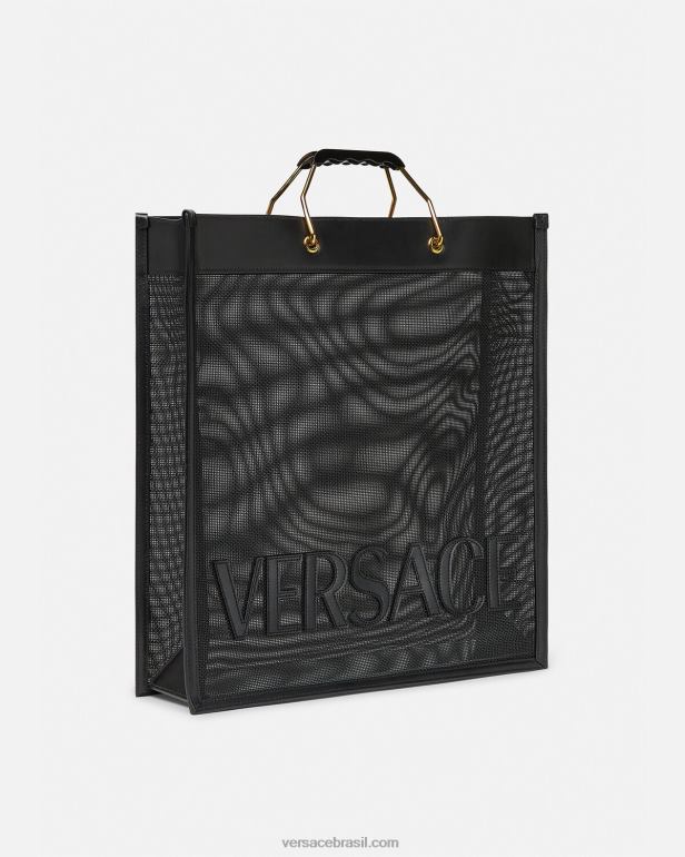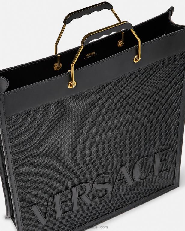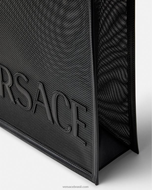a sacola de compras Versace é feita em uma construção de rede durável com acabamentos em couro e letras tonais do logotipo frontal. alças superiores ergonômicas e rígidas de metal acentuam o acessório espaçoso.