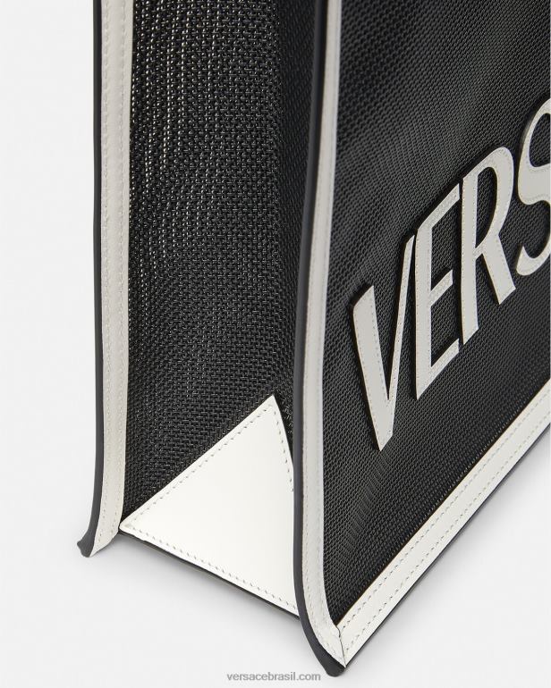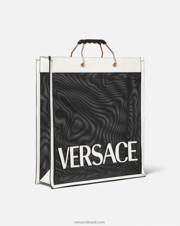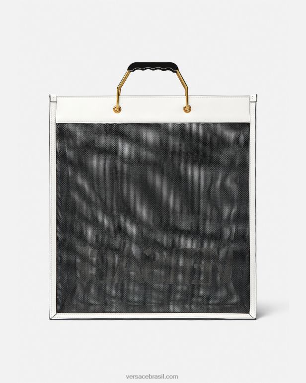 a sacola de compras Versace é feita em uma construção de rede durável com acabamentos em couro e letras tonais do logotipo frontal. alças superiores ergonômicas e rígidas de metal acentuam o acessório espaçoso.