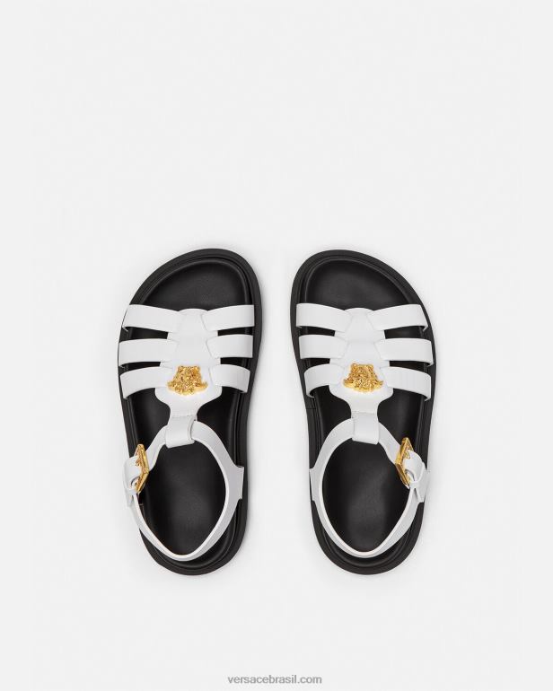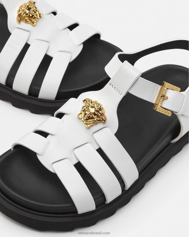 com solas moldadas confortáveis, essas sandálias de tiras de couro são acentuadas pela placa la medusa.