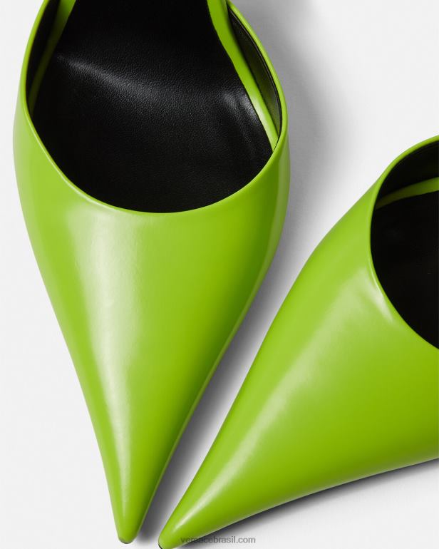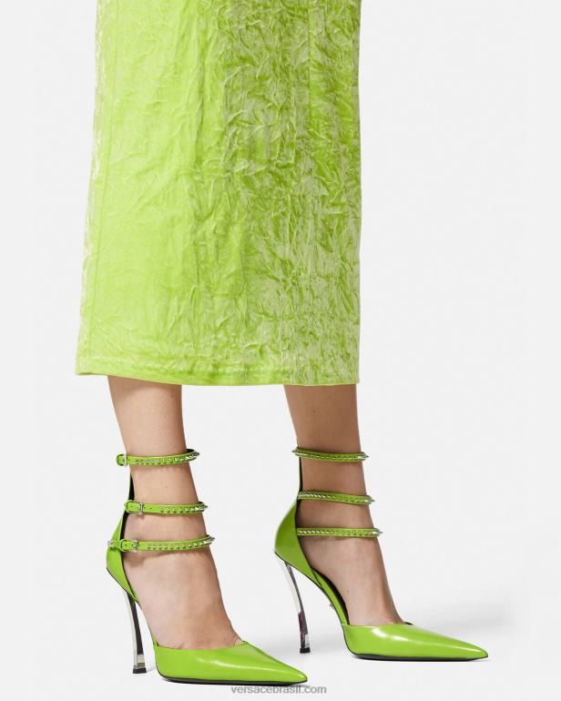 caracterizados por saltos agulha altos e curvos, esses sapatos de couro apresentam dedos pontiagudos e tiras com fivela tripla na frente. eles são acentuados por pontas e ferragens em forma de V ao longo das tiras.