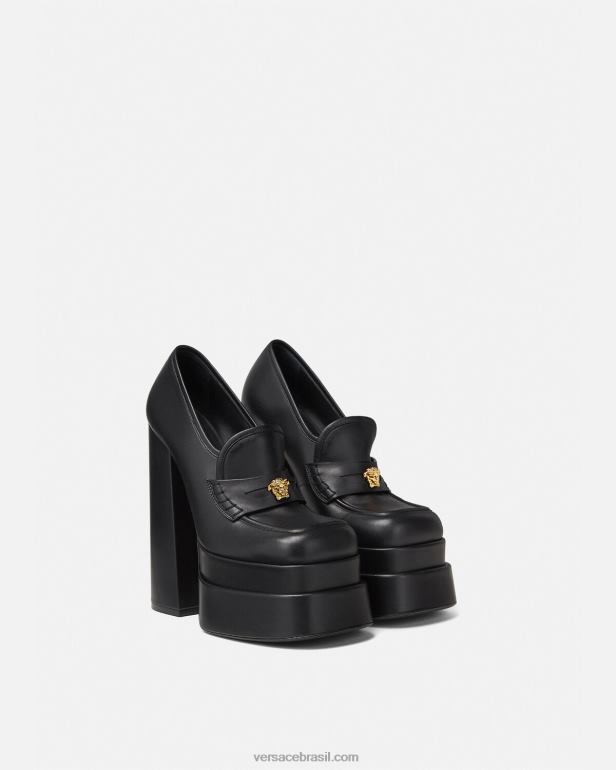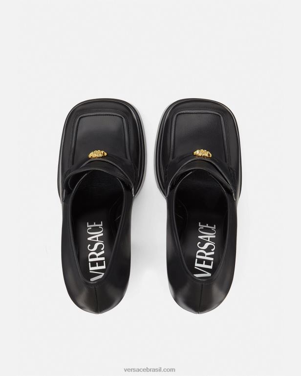 vistos na passarela, esses mocassins extravagantes apresentam salto alto bloco e plataforma dupla. confeccionado em couro de bezerro flexível, o par é enriquecido com ferragens medusa exclusivas na pulseira.