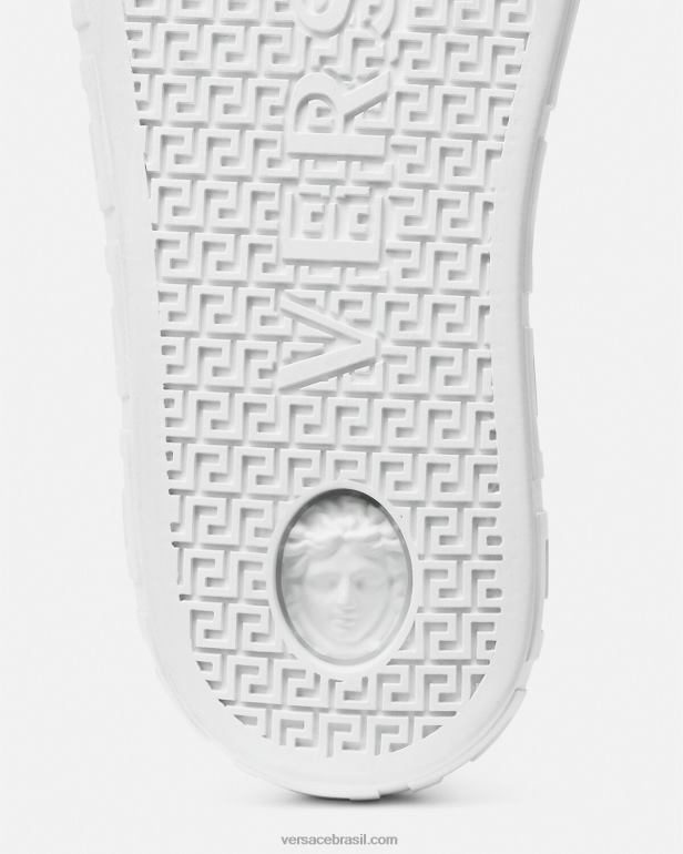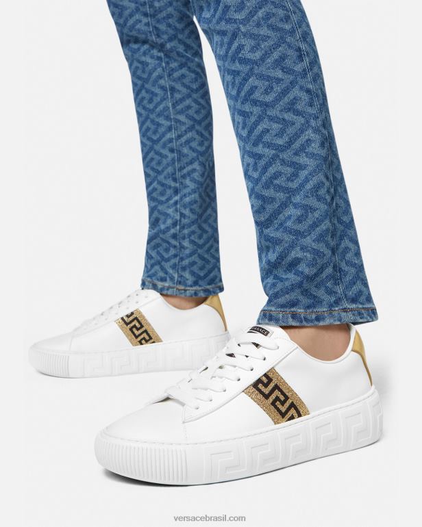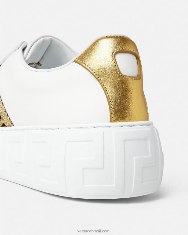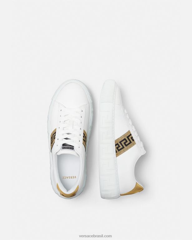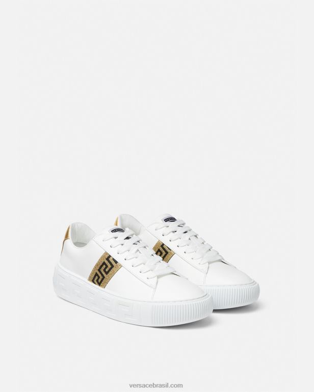 a silhueta de cano baixo é caracterizada por um padrão greca gravado em solas de borracha vulcanizada, com parte superior em couro com uma faixa greca contrastante.