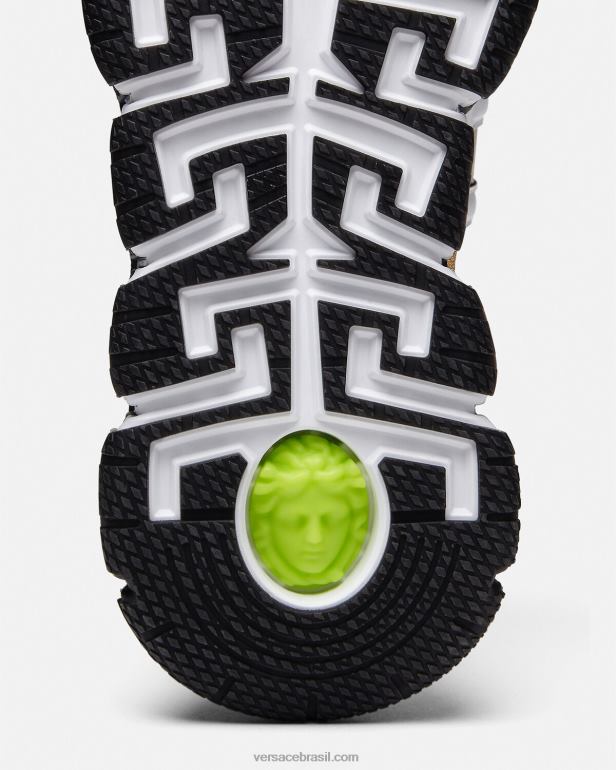 os tênis trigreca trazem inovação à estética em constante evolução da marca. as execuções tridimensionais de greca nas solas oferecem uma aterrissagem impactante com o "sistema de amortecimento greca". em uma homenagem sutil à cidade natal da Versace, a parte superior tem uma impressão discreta das coordenadas de Milão.