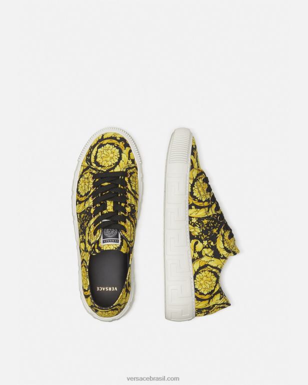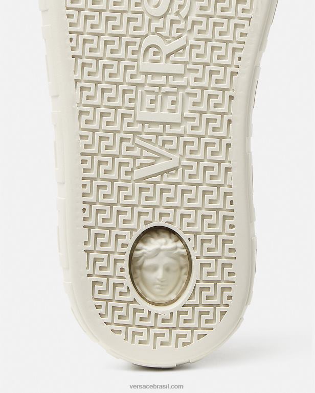 A mais recente silhueta de tênis da Versace, greca, é caracterizada por linhas discretas e limpas e pelo padrão gráfico greca na entressola. o design em lona leve traz a estampa barroca, enquanto a sola esconde uma medusa no calcanhar.