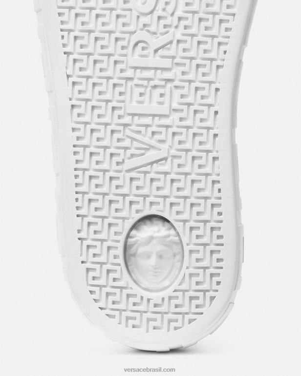 caracterizada por um padrão greca gravado em solas de borracha vulcanizada e rede greca lateral, a silhueta de cano baixo apresenta parte superior de couro e um design com cordões. um logotipo estampado nas costas acentua o estilo com cadarços.