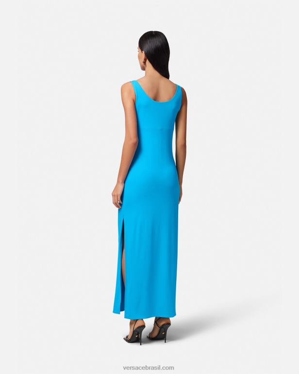 Versace apresenta dua lipa x versace – uma coleção cápsula co-desenhada com dua lipa. confeccionado em uma silhueta justa, este vestido de crepe tem um design sem mangas com detalhes de medusa '95 nas alças. o estilo noturno é detalhado com um decote drapeado.