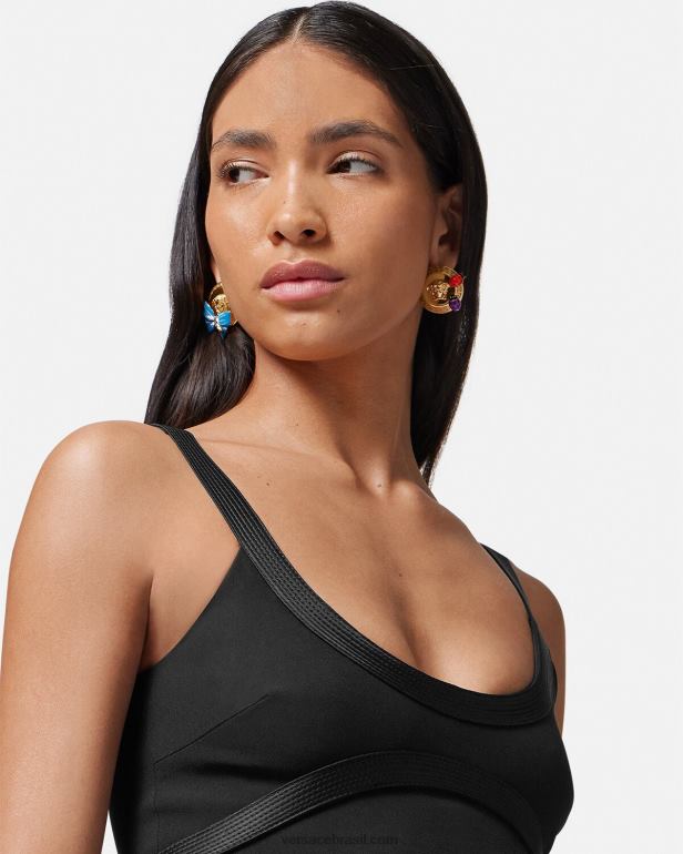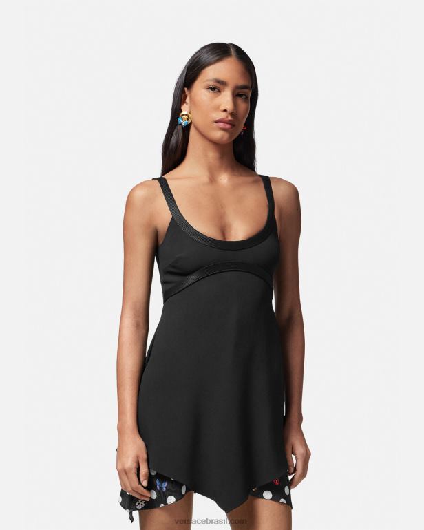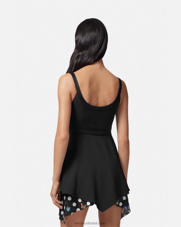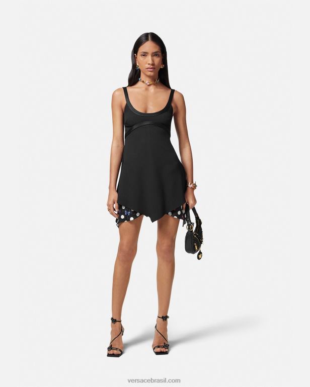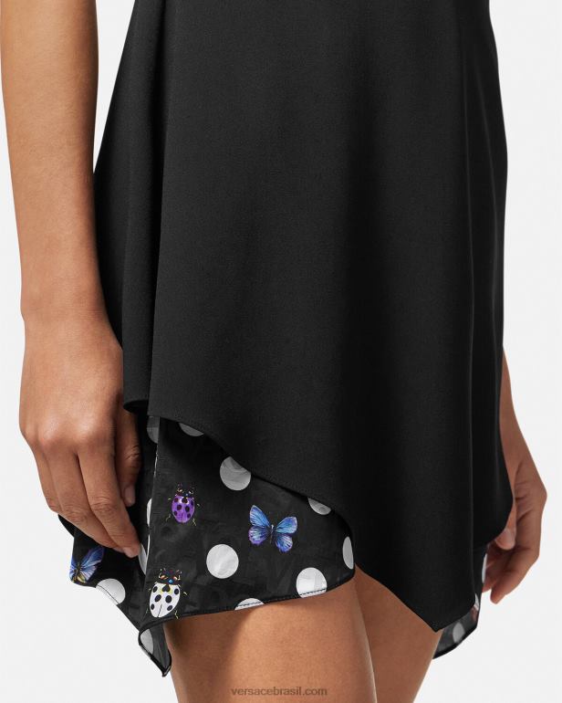 Versace apresenta dua lipa x versace – uma coleção cápsula co-desenhada com dua lipa. este minivestido largo apresenta acabamentos de cetim 'nastro gianni' com costura superior e borboletas em camadas e painéis fluidos com bolinhas de joaninhas com um padrão versace tonal em toda a peça.
