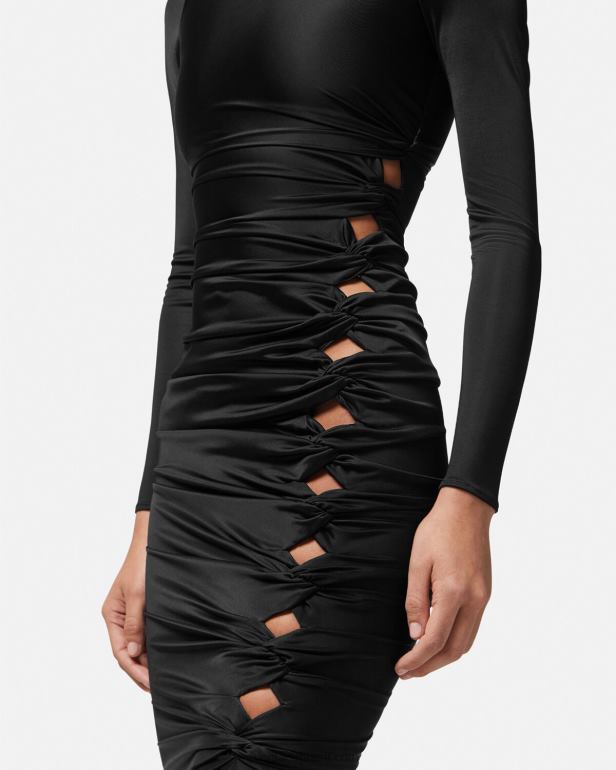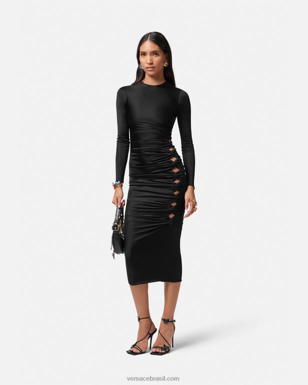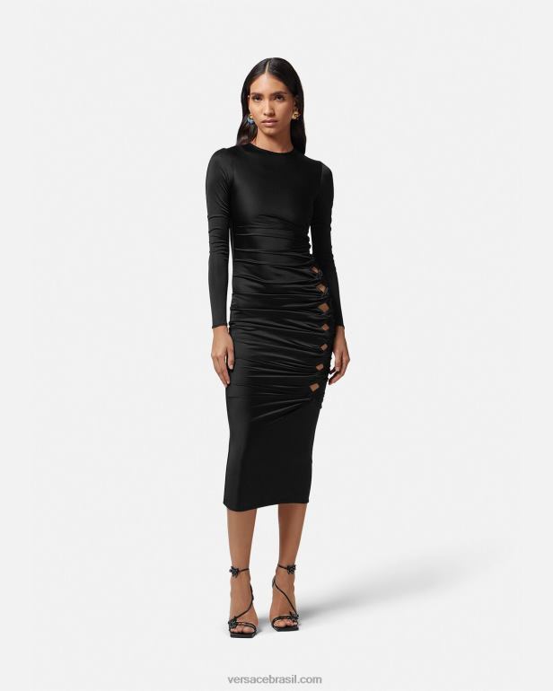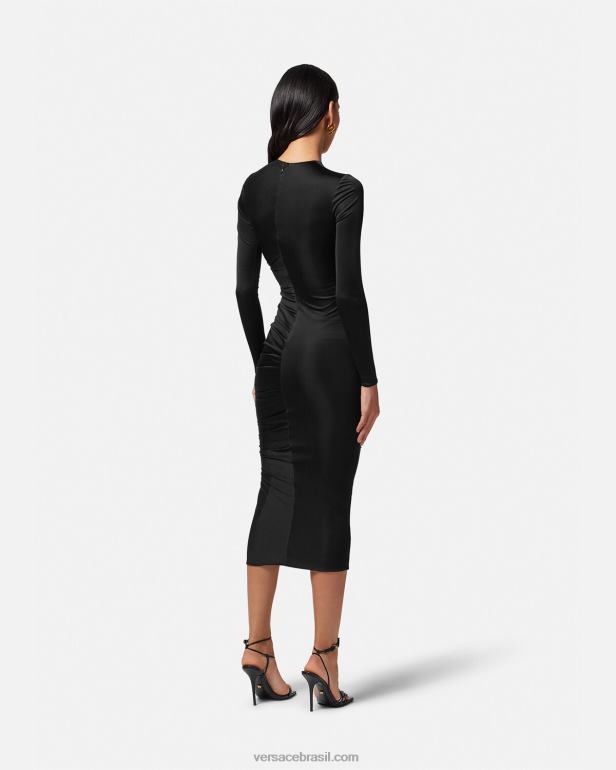 dua lipa é designer convidada da coleção cápsula dua lipa x versace, feita em colaboração com donatella versace. este vestido midi de mangas compridas é confeccionado em jersey fluido com detalhes recortados com nós nas laterais para um efeito drapeado.