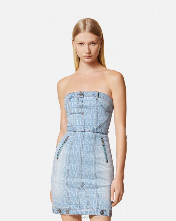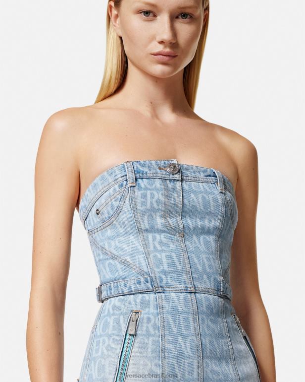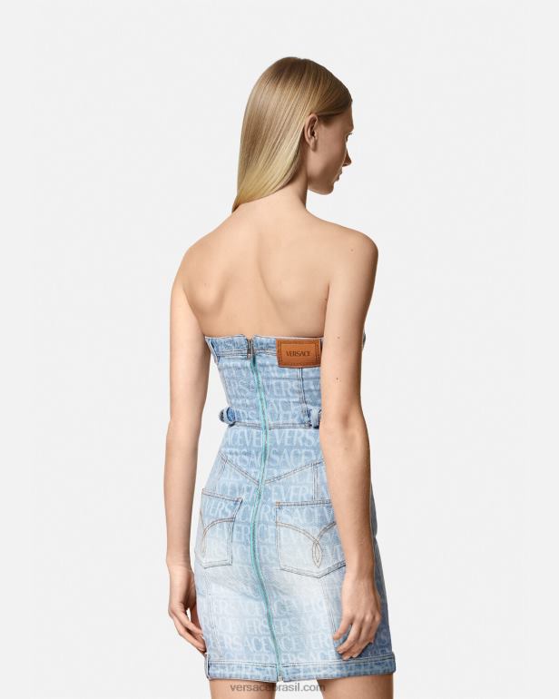 este minivestido sem alças é feito de jeans lavado com pedra e estampa Versace a laser com detalhes em medusa.