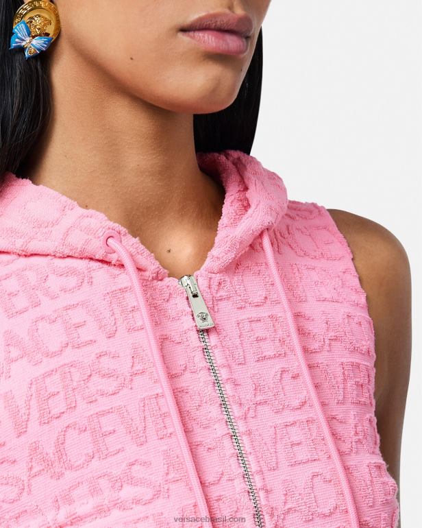 Versace apresenta dua lipa x versace – uma coleção cápsula co-desenhada com dua lipa. este minivestido pronto para usar com capuz tem um design sem mangas com zíper na frente, uma textura tonal versace em toda a textura terry e é totalmente forrado.